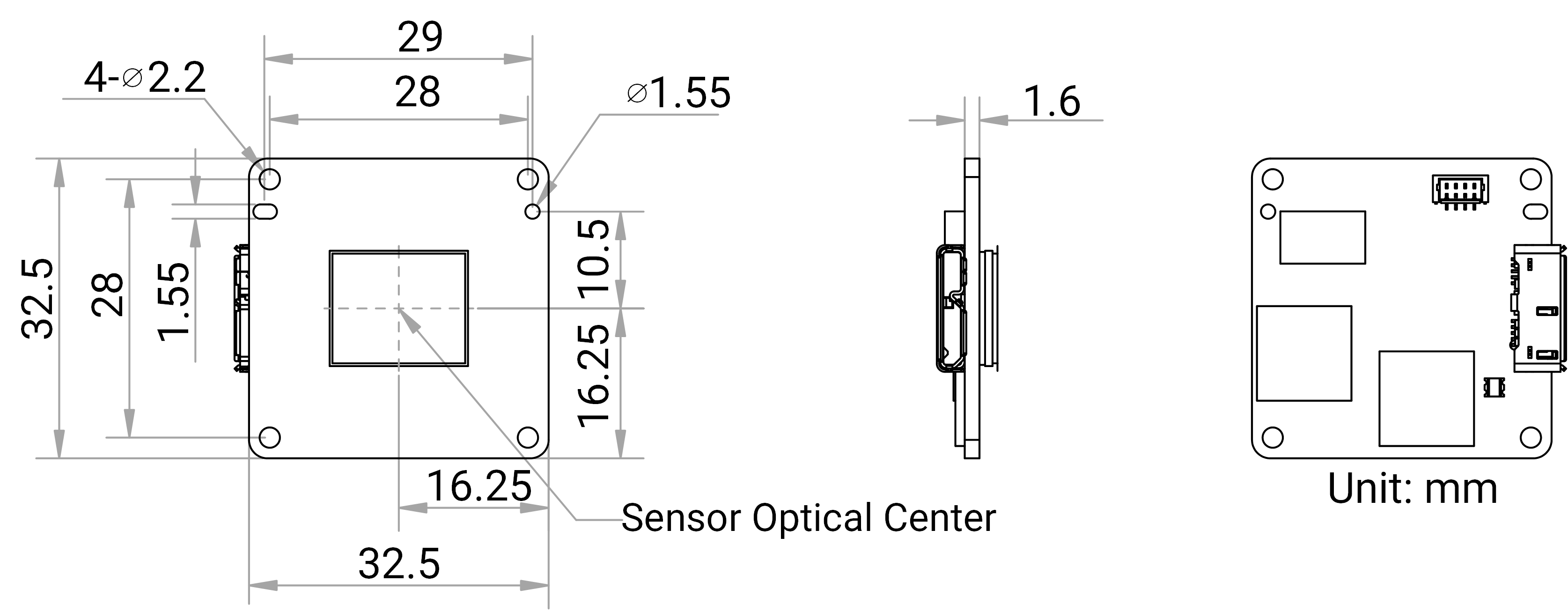 - Bare Board camera: 32.5 mm × 32.5 mm × 1.6 mm (1.3" × 1.3" × 0.1")